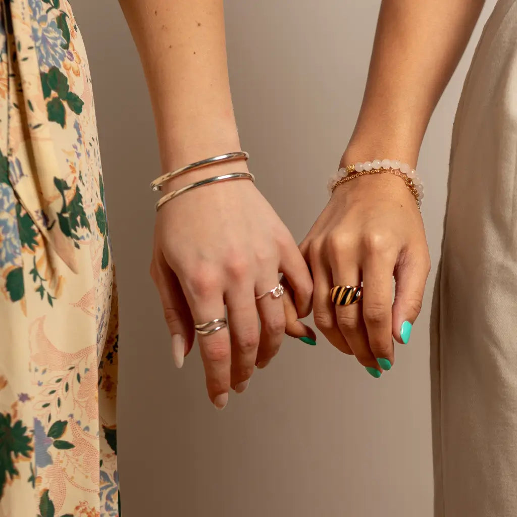 Our silver-plated pieces are rhodium-plated over brass, showcasing a highly reflective quality that resists tarnishing. Rhodium is allergy-friendly, harder than gold, and exceptionally durable