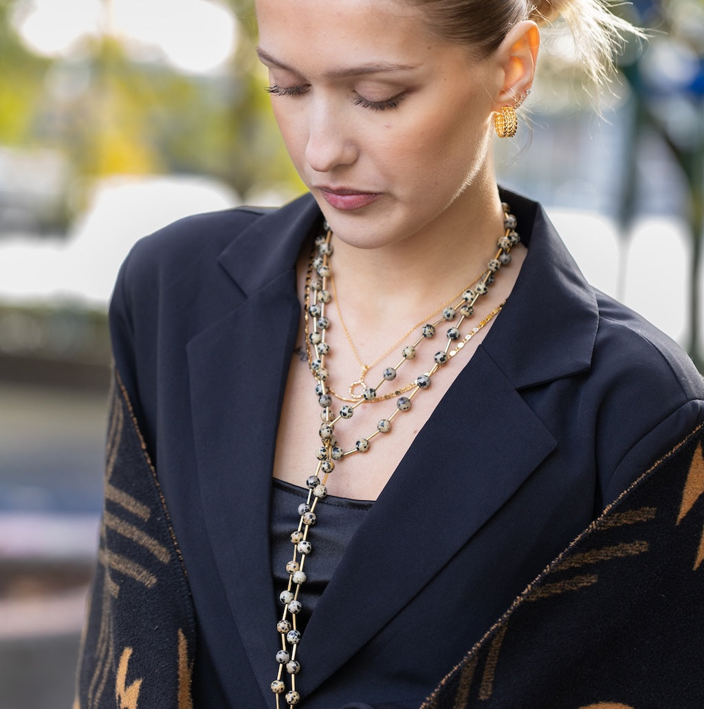 Introducing our exquisite Dalmatian Jasper Gemstone Necklace, a stunning handmade piece designed to elevate your style. This 70" long necklace showcases the unique beauty of Dalmatian Jasper gemstones and offers versatile wear options. Whether wrapped, layered, or worn long, this necklace adds a touch of elegance and adaptability to any outfit. Perfect for the modern jewelry lover who appreciates both craftsmanship and versatility.